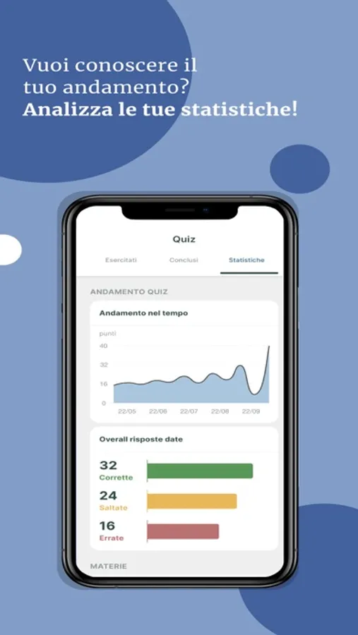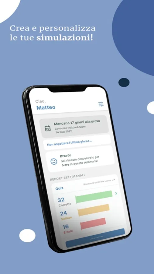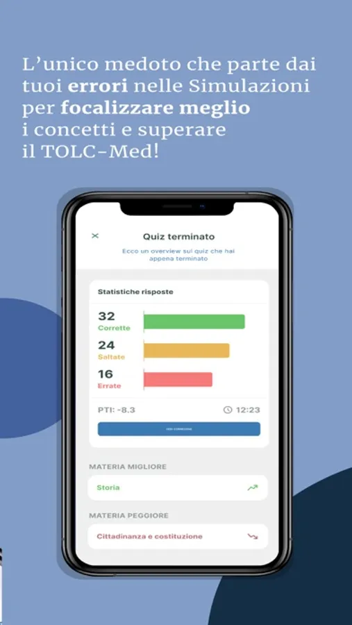 Costruisci il tuo futuro insieme a noi e preparati per realizzare i tuoi sogni grazie ad un app particolare e utilissima che ti permetterà esercitarti in vista della prova, ma non solo. Grazie a un sofisticato “metodo di ancoraggio mentale” ogni concetto si consoliderà facilmente nella tua memoria. Il metodo applica all’esercitazione sui quiz la ripetizione dilazionata, ovvero ripetere le nozioni a intervalli regolari per aiutare la memorizzazione a lungo termine dell'informazione. Utile per apprendere a rispondere nel modo corretto a quelle domande che hai sbagliato in passato.