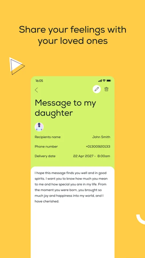 Set the date and time for your messages to be delivered. Whether it's a heartfelt note, important instructions, or a surprise message that you wish someone to read later, FinhApp ensures that your words reach the intended recipient at the perfect moment.