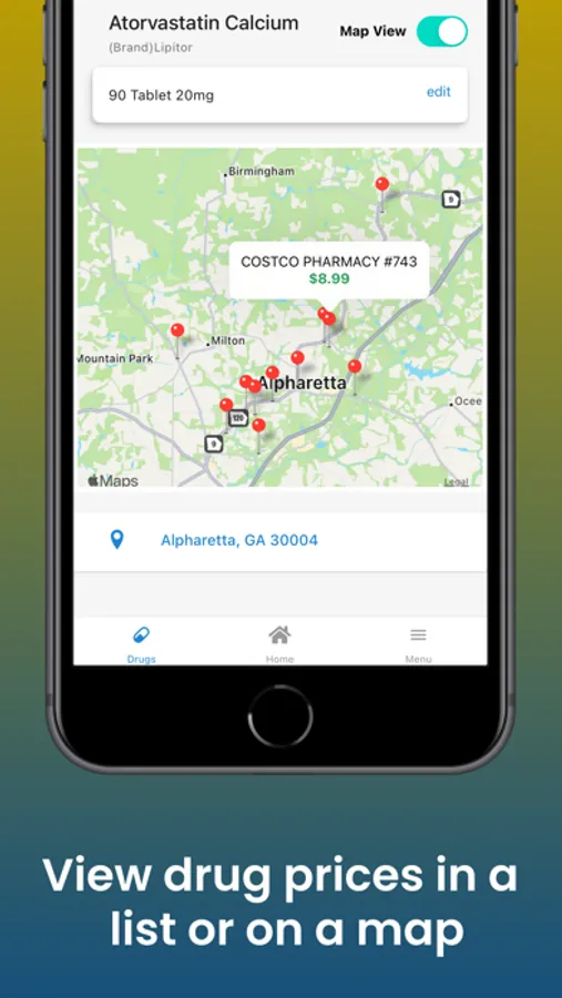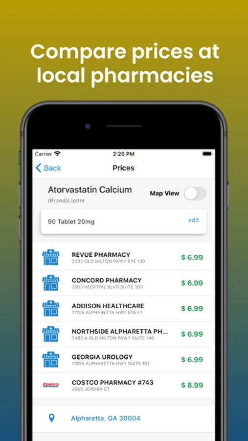 View price results at nearby pharmacies as a list or on the map.