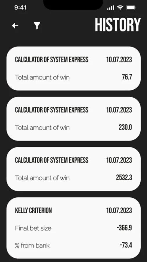 MyBookie also keeps a comprehensive history of your calculations, ensuring you have a detailed record of your past strategies. With the ability to filter the history by date and type, you can quickly revisit and learn from your previous analyses, fine-tuning your approach for future endeavors.