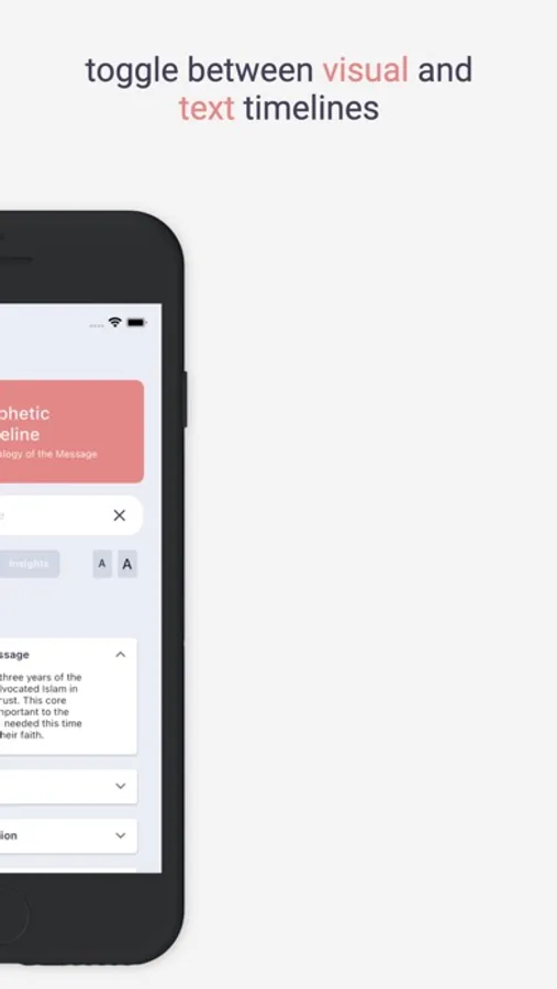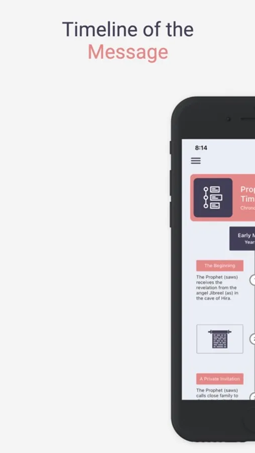 The timeline provides information about what happened in the life of the Prophet Muhammad, after he received the message. There is a visual timeline provided, and this converts to a textual timeline if the icon at the top is pressed, where the user can toggle between the two.