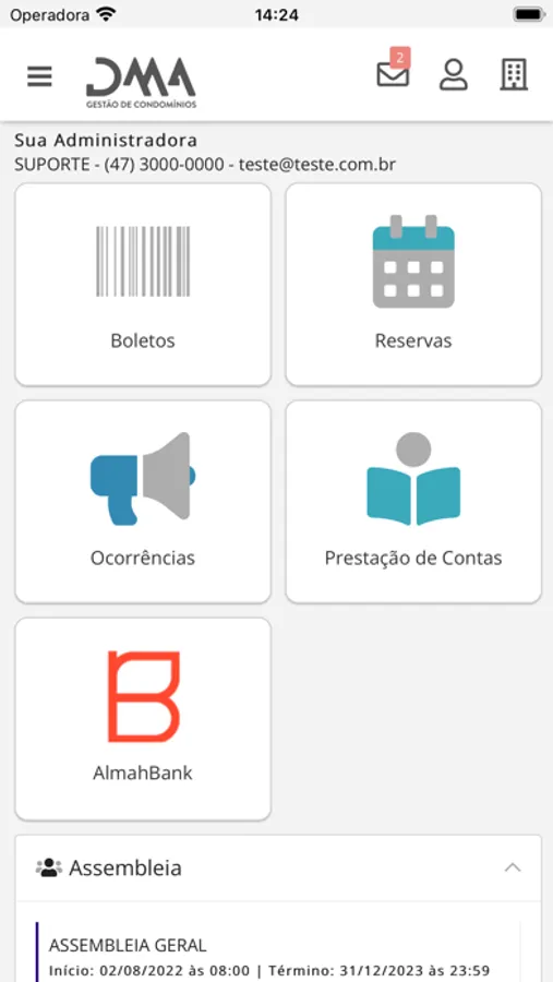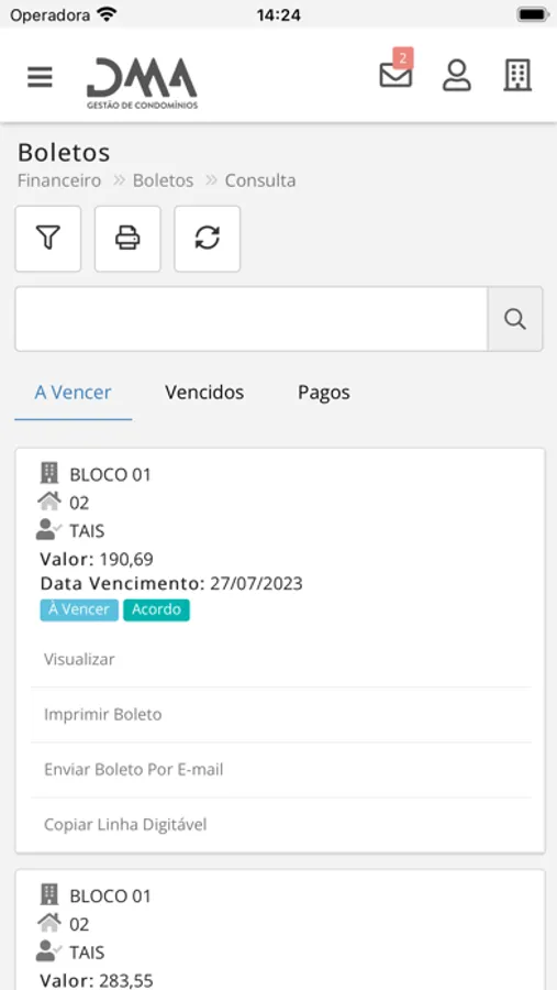 - Visualização de boletos em aberto para sua unidade;