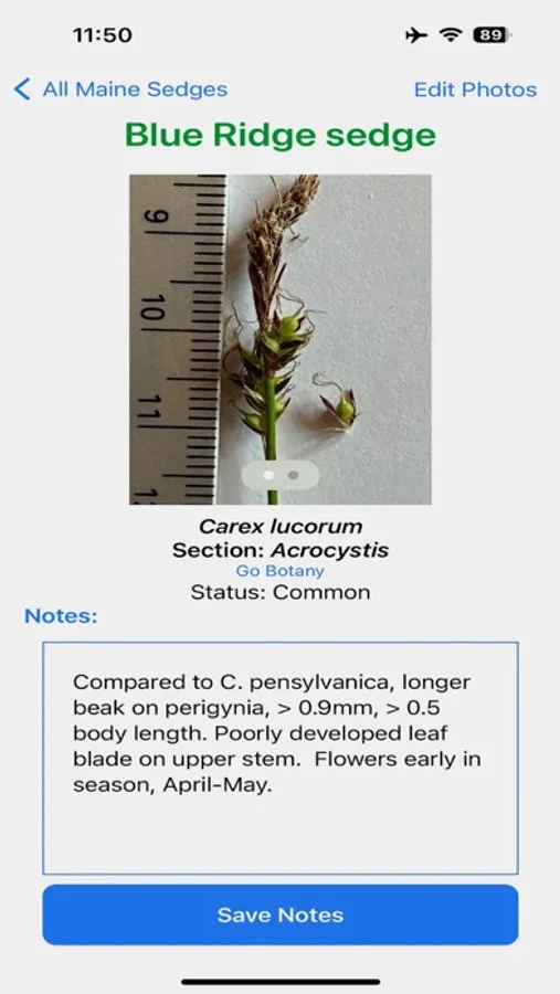 Sedgescape is a tool for studying the sedges of Maine. It comes preloaded with a list of all Maine sedges plus photos and identification notes for the common species. Users can add additional photos and notes of their own to document their observations.