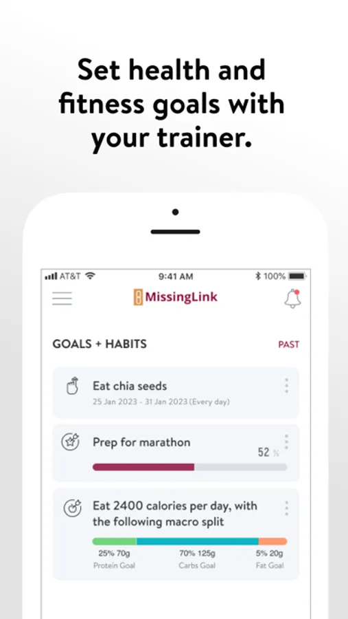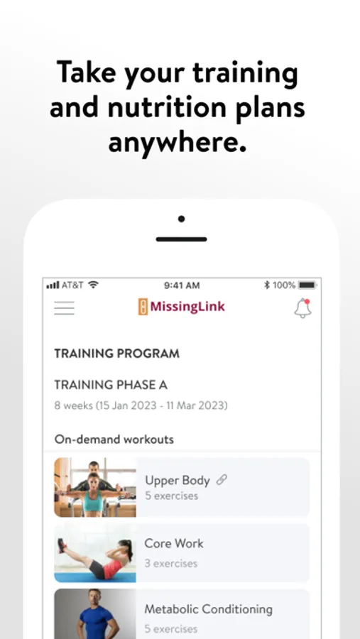 With the Missinglink Fitness and Nutrition App, you will have access to workout programs designed specifically to help you reach your fitness and health goals! You can follow & track your workouts, your nutrition, your lifestyle habits, measurements and results–all with the help of your coach.