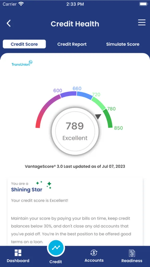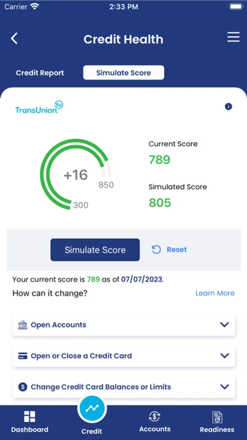 Your credit score is prominently displayed in your dashboard - and it doesn't cost you anything. Track changes month to month and learn the key factors that make up your score like length of credit, timely payment history, utilization of credit, total accounts opened and inquiries. Don't worry, this is a "soft credit pull" meaning there is no impact to your score by checking it. Look through your credit report for accuracy. Access helpful articles that explain credit bureaus, credit score, and more.