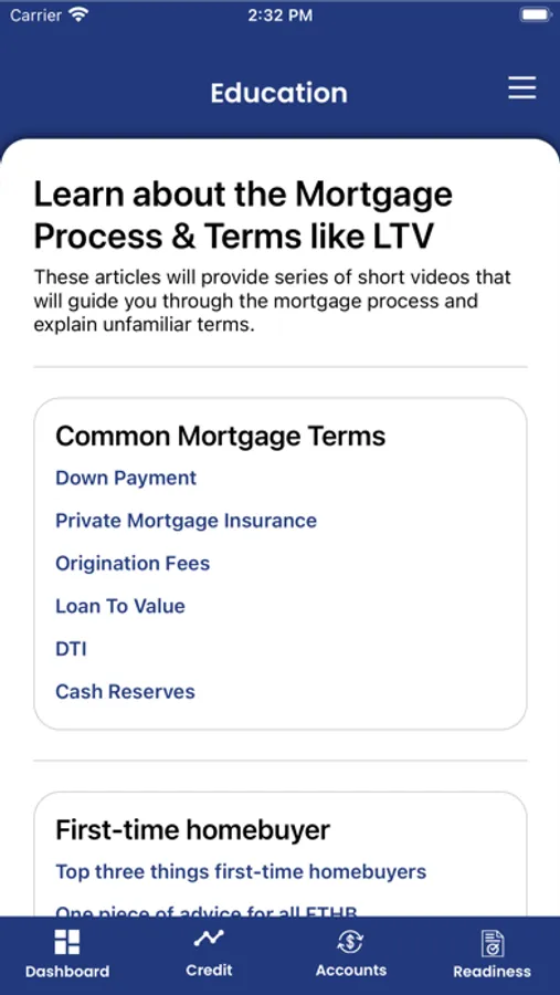 Work with your financial partner or institution to best prepare you for home ownership by planning for a down payment, establishing reserves, managing your debt to income ratio, improving or maintaining your credit, loan scenarios through our calculators, establish your projected loan to value, and more. Visit the readiness assessment in your app to see a snapshot of your credit overview, debt to income ratio, cash reserves, employment, down payment and sales price.