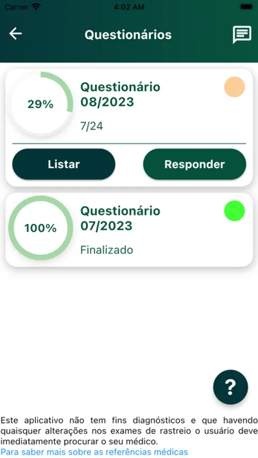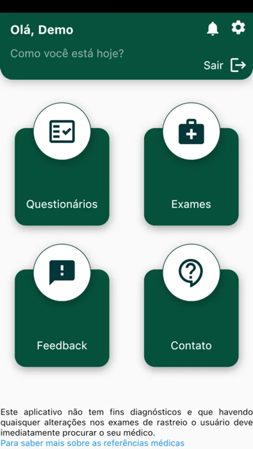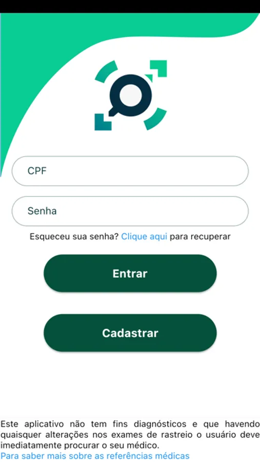 Este aplicativo não tem fins diagnósticos e que havendo quaisquer alterações nos exames de rastreio o usuário deve imediatamente procurar o seu médico.