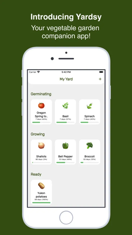 Introducing Yardsy, a mobile companion app for your vegetable garden. Manage your crops and track progress from seeding through harvest, whether you’re a first time or seasoned gardener.