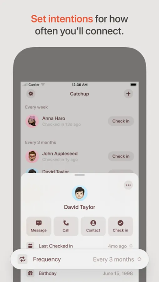 Catchup is a simple, beautiful way to nurture your most important connections through consistent touchpoints. Add the people you care about, set meaningful connection goals, and get gentle reminders to reach out.