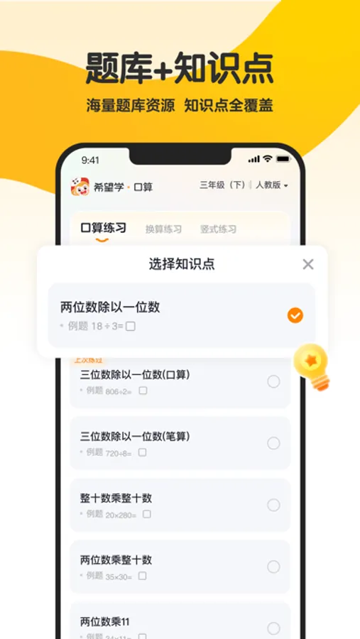 随时随地,想练就练,希望学口算支持拍照判题,家长上班忙下班累,没时间帮孩子检查作业?只需打开app,1秒轻松检查作业!更有丰富的知识点覆盖与题库覆盖,无论任何小学学龄阶段,都可以找到适合自己的题型与练习。并且,希望学口算支持自主调节习题数量,孩子可以根据自己的实际情况,选择口算练习内容和数量,定制属于自己的数学训练计划。让孩子针对自己的薄弱点进行有针对性的训练,家长也可以作为数学题生成器来使用,自动出题、自动判题,给出口算题卡的答题结果,方便家长进行口算检查,更伴随着精美可爱的界面设计,让孩子远离枯燥乏味。
