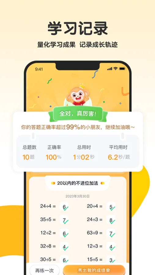 除此之外,希望学口算可以及时记录孩子的答题情况和表现,孩子可以清楚地了解自己的水平和提高,进一步激发自己的学习兴趣和动力。家长可以见证孩子一点一滴的进步,更密切的陪伴孩子成长。