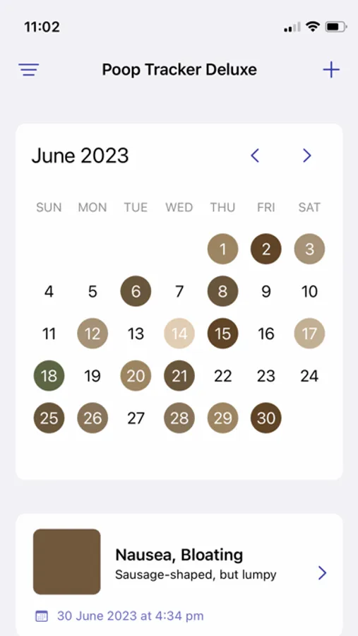 Visualize your digestive patterns in one glance with our intuitive calendar. It allows you to easily see frequency and regularity over days, weeks, or months, helping you or your healthcare professional identify patterns or potential issues.