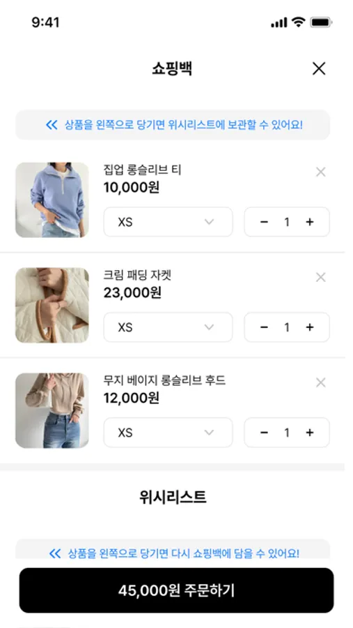 복잡한 화면과 과정 없이 옆으로 밀어서 내 취향에 맞는 옷들을 둘러보고,