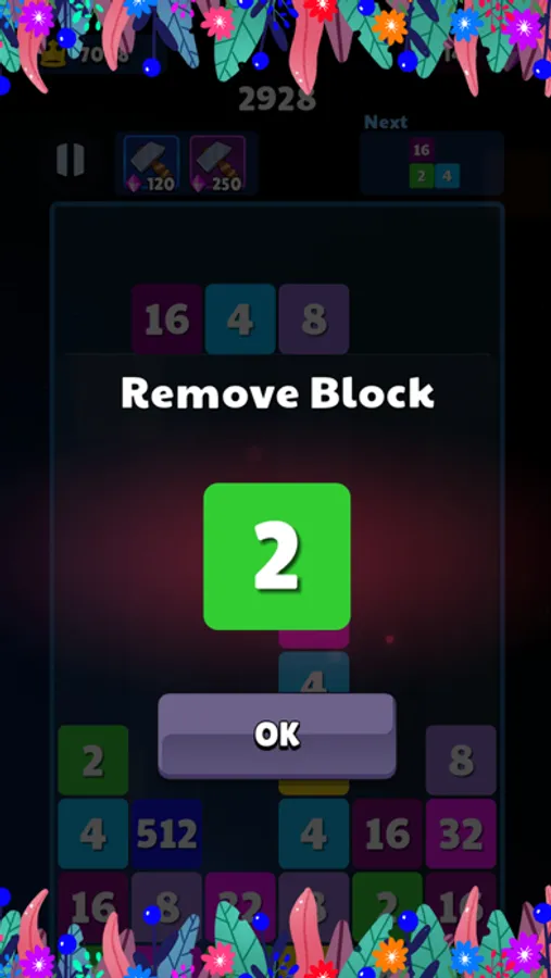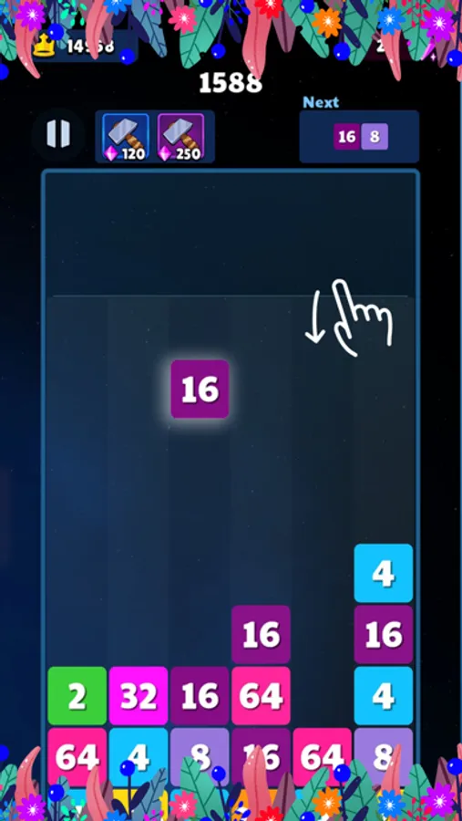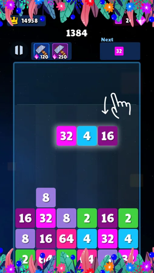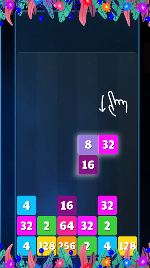 * Swipe the screen left or right to place blocks and connect blocks of the same number in one of eight directions (up, down, left, right) to merge them.