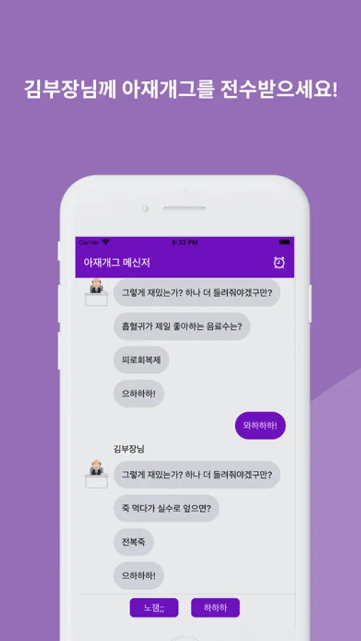 매일매일 재미있을지도 모르는(?) 개그를 알림으로 받을 수 있습니다! 스케쥴 기능을 통해 정해진 시간에 개그를 받아보세요! 당신의 아재개그 멘토 김부장님으로부터 궁극의 아재개그를 전수 받으세요! 유머를 좋아하신다구요? 개그맨을 꿈꾸신다구요? 당신도 내일은 재밌는 개그를 구사할 수 있게 될 것입니다!