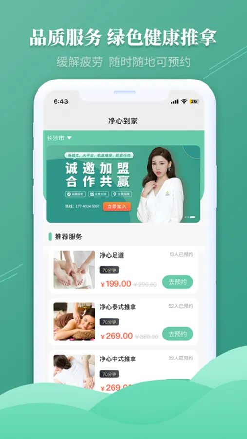 净心到家 是国内领先的 互联网O2O上门按摩推拿平台 是国内领先的上门服务的专业平台 。平台技师均经过实名认证 专业培训 考试 通过后方可上岗接单 专注于提供绿色专业的推拿保健按摩服务 致力于为用户提供最靠谱 实惠 专业的服务与体验。轻松预约 净心到家 。欢迎你下单体验 净心到家全体工作人员 期待你的预约。预约按摩 首选净心到家