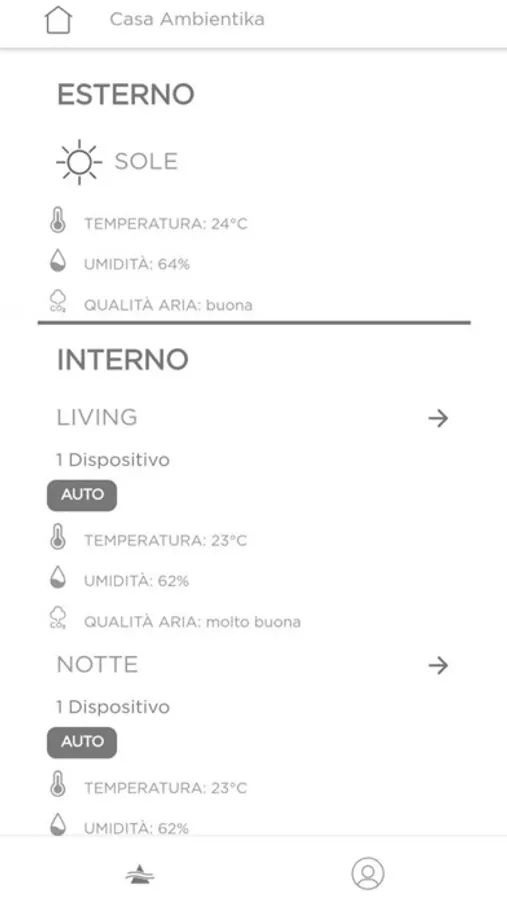 Ambientika APP si collega alle centraline metereologiche per la rilevazione delle condizioni ambientali esterne ed è in grado di monitorare lo stato della qualità dell'aria dell'abitazione tramite un sensore VOC installato a bordo macchina.