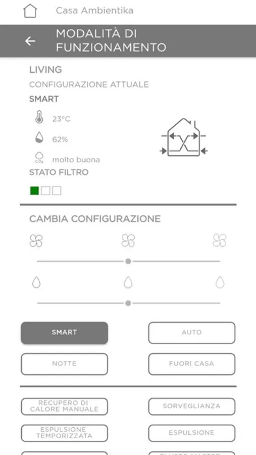 Con Ambientika APP sono impostabili più di dieci differenti modalità di funzionamento (Automatica, Manuale, Sorveglianza, Smart, Fuori Casa, Espulsione Temporizzata, Notte, Immissione, Estrazione, Flussi d'aria) e quattro portate d'aria.