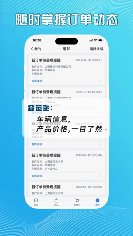 为方便客户日常管理,提高客户管理效率,节约客户管理成本,本公司自主研发了一款专注于卡客车后市场应用的软件平台,软件具有查询、下单和推送功能,实现了客户下单与现场服务的同步,客户可实时收到服务信息,查看服务状态。