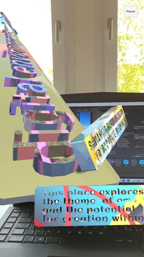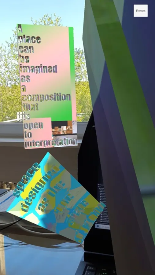 The AR artwork is a sort of game where the audience is called to build infinite architectures and or sculptures by interacting and combining the AI generated phrases. By tapping on the screen, a random phrase appears and it can be scaled, translated and rotated by the audience in order to design a space which will appear made by the pure shape of intuition.