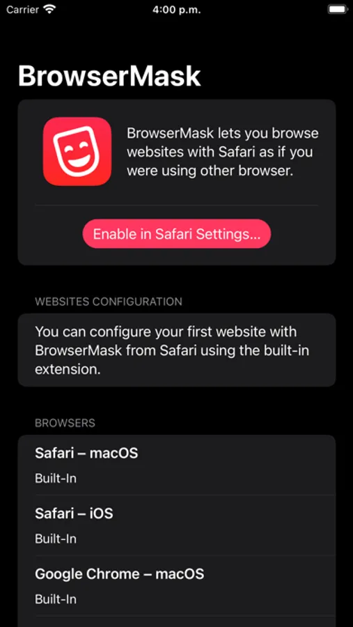 BrowserMask is a Safari extension that allows you to browse websites as if you were using another browser by changing the User Agent sent to the websites by Safari. This way, you can make any website believe it is being shown on other browsers like Google Chrome or Microsoft Edge.