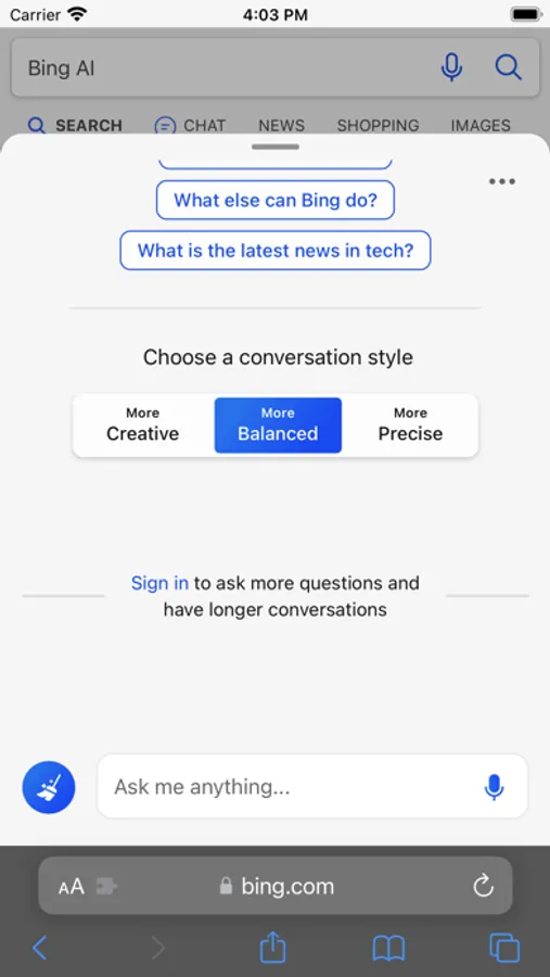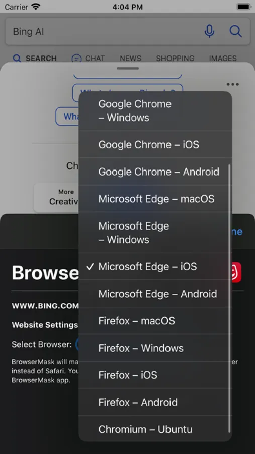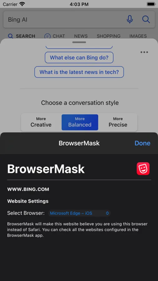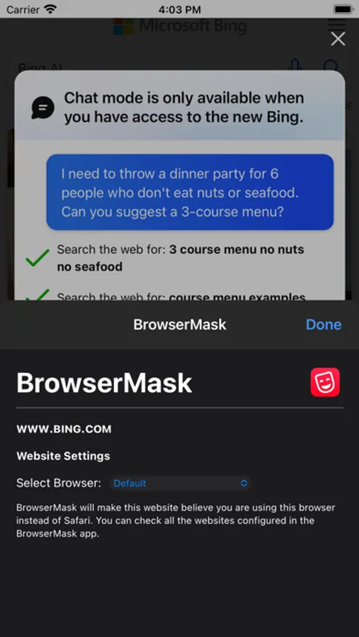 • Set Microsoft Edge as the masked browser on bing.com to be able to use Bing Chat from Safari.