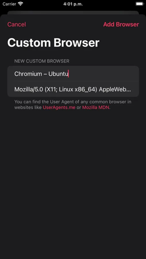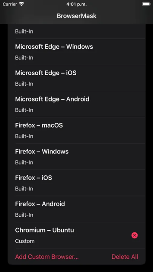 • BrowserMask includes multiple popular browsers built-in and you can add any custom one by defining its User Agent.
