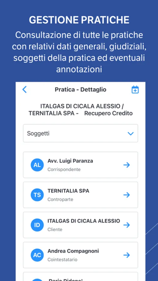 Con l’agenda legale della TeamSystem Legal App sarete sempre informati su impegni e udienze inseriti all’interno del gestionale e non perderete mai un appuntamento.