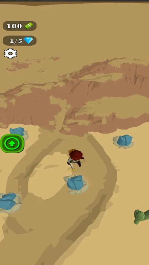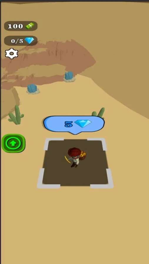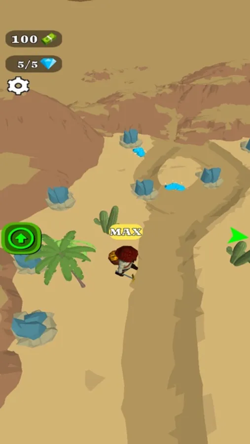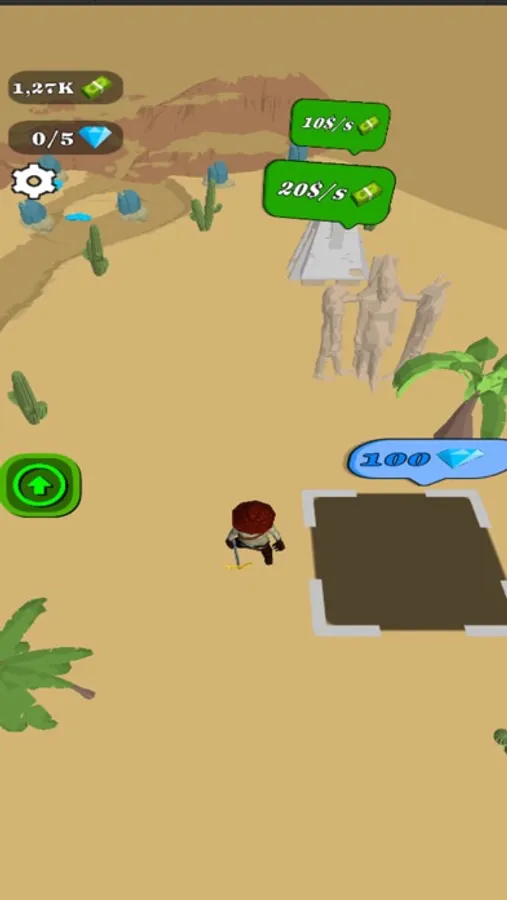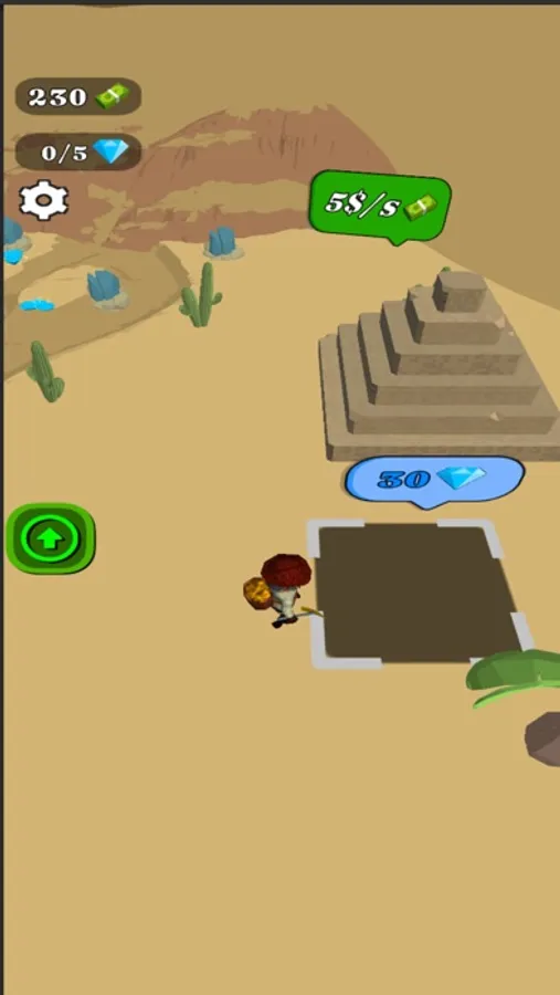 Engage in diamond mining activities within the desert mines. Your character carries a backpack with a limited capacity for diamonds. Buildings can only be constructed using diamonds. To build each subsequent structure, you'll need to mine more diamonds, but each new building yields greater profits. Use your earnings to upgrade your character's attributes, including walking speed, mining speed, and backpack capacity.