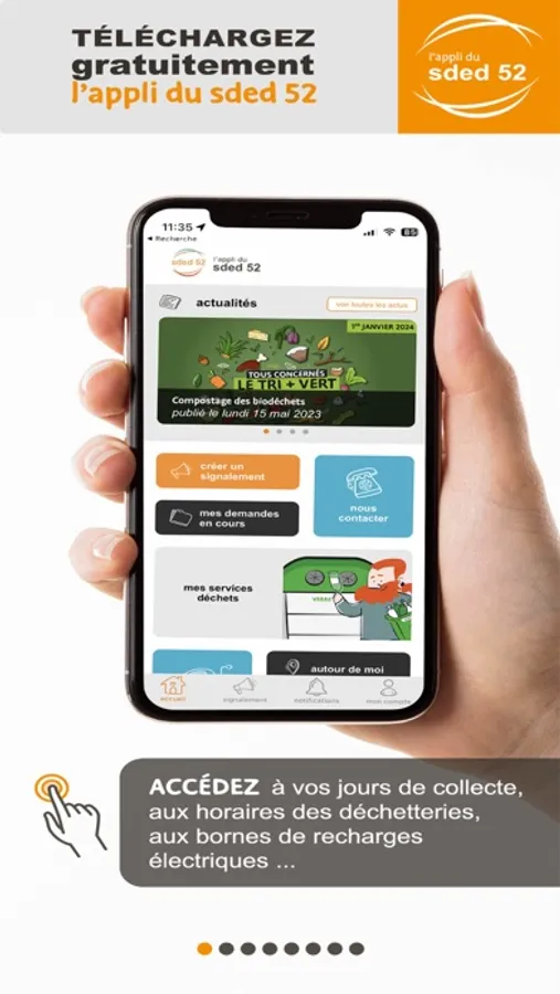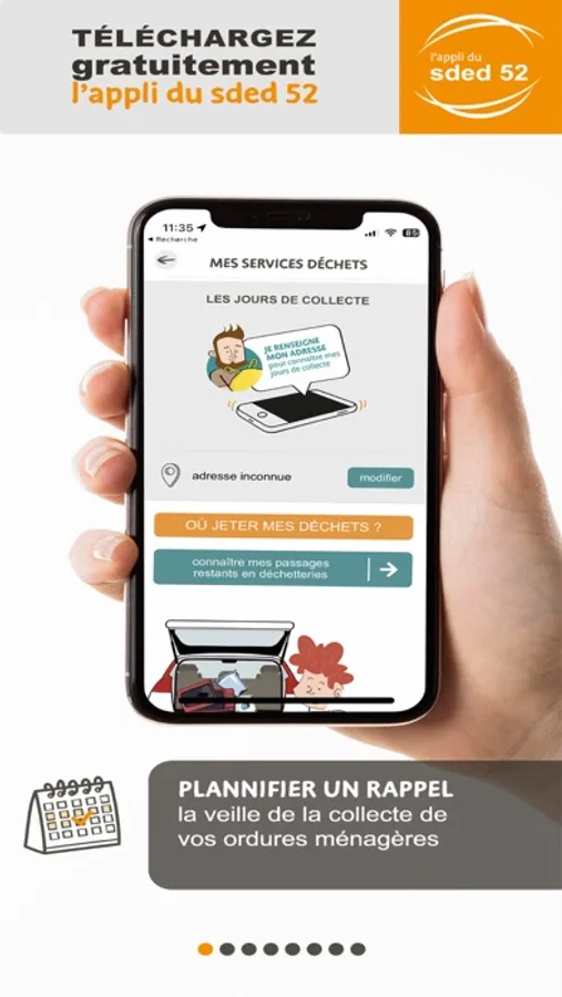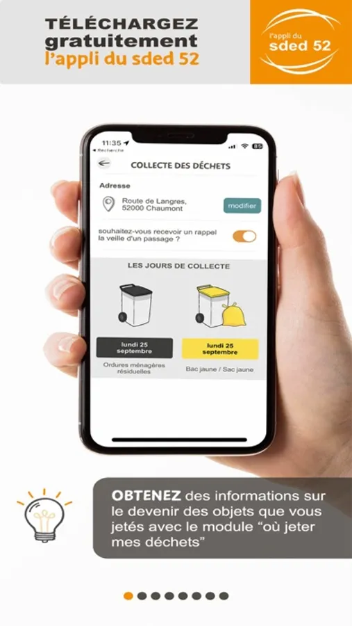 Optimisez la gestion de vos déchets avec SDED 52 ! Découvrez le calendrier de collecte de vos déchets, repérez les bornes à verre à proximité, suivez vos passages en déchetterie et explorez d'autres fonctionnalités !