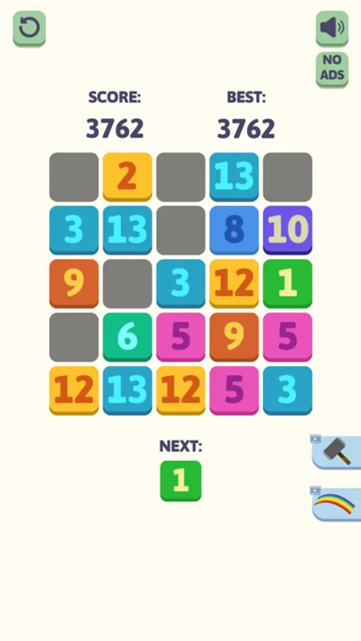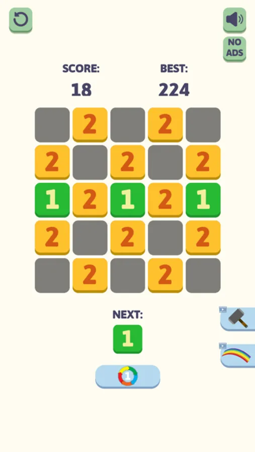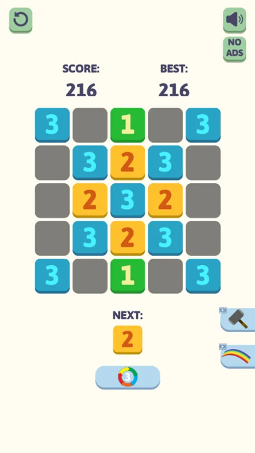 Merge numbers by adding tiles with the same number to the field next to already placed tiles (vertically or horizontally).