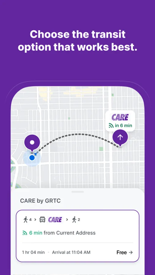 To get started, enter your phone number to log into your account. Then, schedule your ride with just a few taps - enter your pick up and dropoff address, and select the date and time for your ride. Finally, you can open the app near the time of your ride to monitor your vehicle on its way. The CARE by GRTC app lets you book one-time trips, standing trips, and view or cancel future trips.