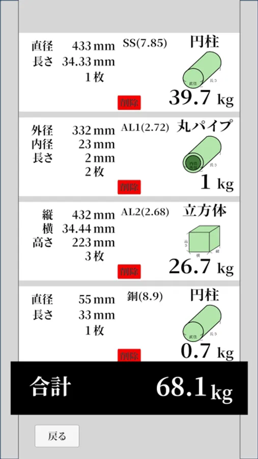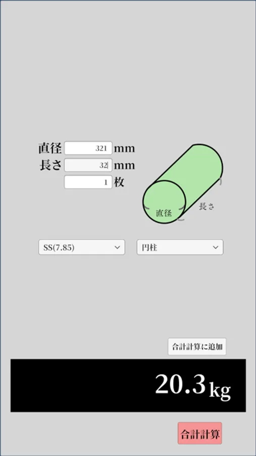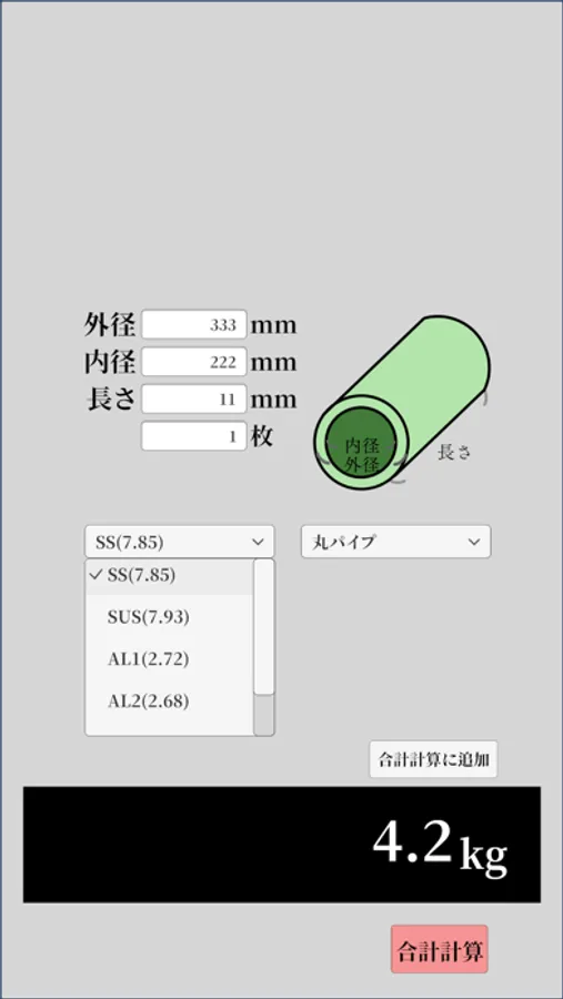 入力した図形情報を合計計算に追加することで複数の図形の重量の合計を計算できます。