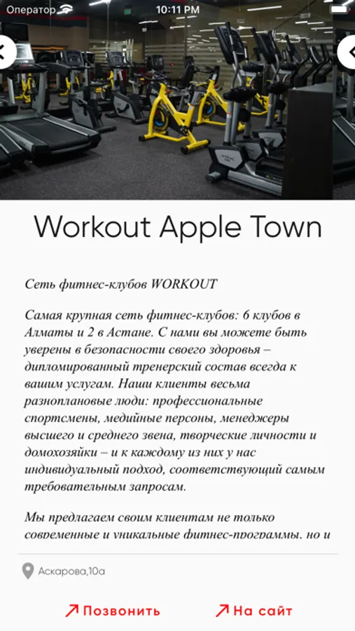 Самая крупная сеть фитнес-клубов: 6 клубов в Алматы и 2 в Астане. С нами вы можете быть уверены в безопасности своего здоровья – дипломированный тренерский состав всегда к вашим услугам. Наши клиенты весьма разноплановые люди: профессиональные спортсмены, медийные персоны, менеджеры высшего и среднего звена, творческие личности и домохозяйки – и к каждому из них у нас индивидуальный подход, соответствующий самым требовательным запросам.