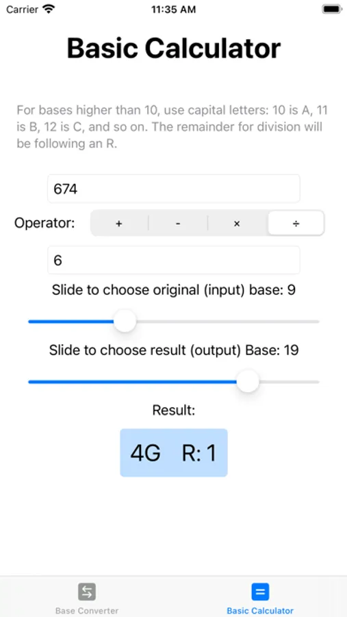 On the first screen you can convert a number from one base to another. Simply type in your number and then drag to choose the input base (the base of your number) and the output base (the base for the number you want).