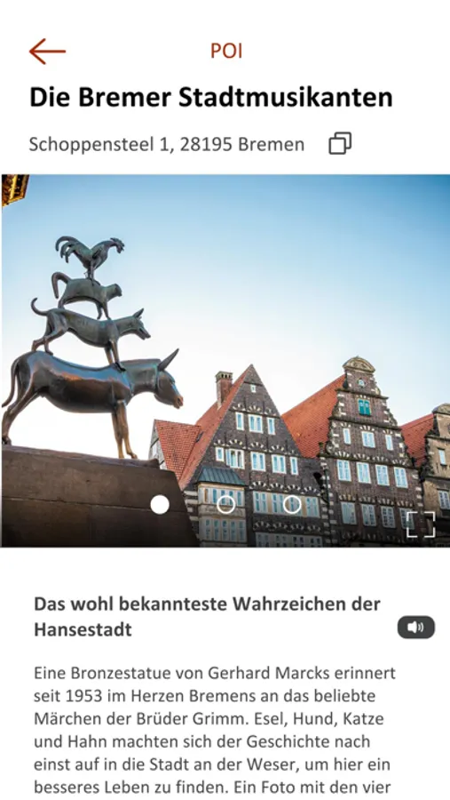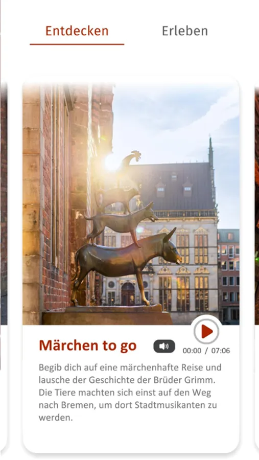 BremenGo ermöglicht euch einen einzigartigen Blick auf die Stadt Bremen und ihre Sehenswürdigkeiten. Die Bremer Stadtmusikanten erwachen als animierte 3D-Figuren zum Leben und begleiten euch auf einer spannenden Tour durch die historische Altstadt der Hansestadt. Dabei übernehmen die vier Tiere die Rolle des Tourguides und versorgen euch mit zahlreichen Eindrücken und Informationen rund um die beliebtesten Bremer Sehenswürdigkeiten. An jeder Station werdet ihr von einem Erlebnis in Augmented Reality überrascht: Neben der Stadtmusikanten Statue erscheint die Räuberhütte in 3D und beim UNESCO-Welterbe Rathaus könnt ihr einen Blick hinter die Fassade werfen. Zahlreiche weitere Erlebnisse warten auf euch. Außerdem erhaltet ihr spannende Fakten zur Bremer Geschichte, könnt Audio Stories mit überraschenden Informationen lauschen und findet interessante Tipps zu Buchungsmöglichkeiten.