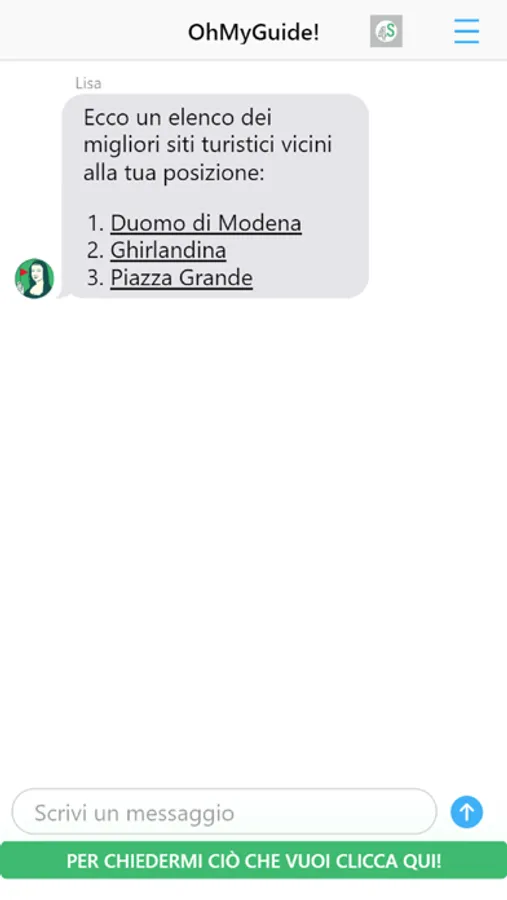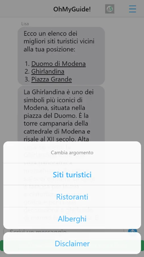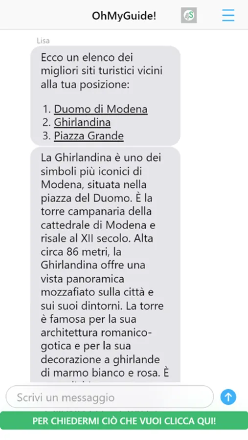 Lisa, il tuo chatbot turistico personale, è pronta a guidarti attraverso un'esperienza di viaggio senza pari. Con la sua conoscenza esaustiva dei luoghi culturali, degli alberghi e dei ristoranti, Lisa ti fornirà indicazioni basate sulla tua posizione geografica e ti aiuterà a pianificare il tuo itinerario.Chiedere il suo aiuto è semplice: apri l'app e comincia a chattare!Sia che tu stia visitando una nuova città o che desideri esplorare il tuo luogo di residenza, OhMyGuide! è l’assistente virtuale che ti farà vivere un’esperienza indimenticabile.