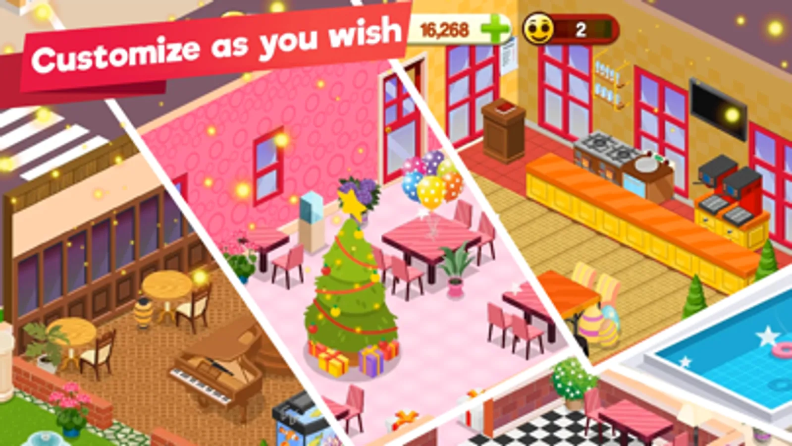 • Decorate your restaurant using your creativity. Get new windows, paint, tiles and doors to stylish your comfy place. Get a variety of furniture, decorations and cooking appliances. The more visual stars you earn, the more popular your restaurant becomes and the more customers will attract.