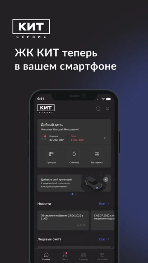 Мобильное приложение УК "Кит Сервис" для жителей и собственников помещений ЖК "КИТ". Легкий способ заказать пропуска, проверить показания счетчиков воды, посмотреть начисления по лицевым счетам, связаться с диспетчерской.