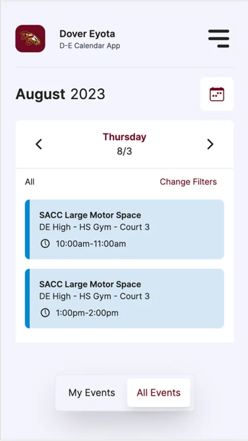 DE-Cal (Dover-Eyota Calendar App) is a user-friendly school calendar app designed specifically for the Dover-Eyota Music Association. It serves as a comprehensive platform that lists school activities and sports schedules, including concerts, rehearsals, competitions, games, and other events. DE-Cal keeps students, parents, and faculty members informed about the latest school happenings, providing regular updates and push notifications for any changes or updates to the schedule. With its intuitive interface and customization options, DE-Cal allows users to personalize their calendar view, ensuring they only see the events they are interested in. Whether it's checking rehearsal times, planning for a concert, or staying up-to-date with sports schedules, DE-Cal simplifies the process.