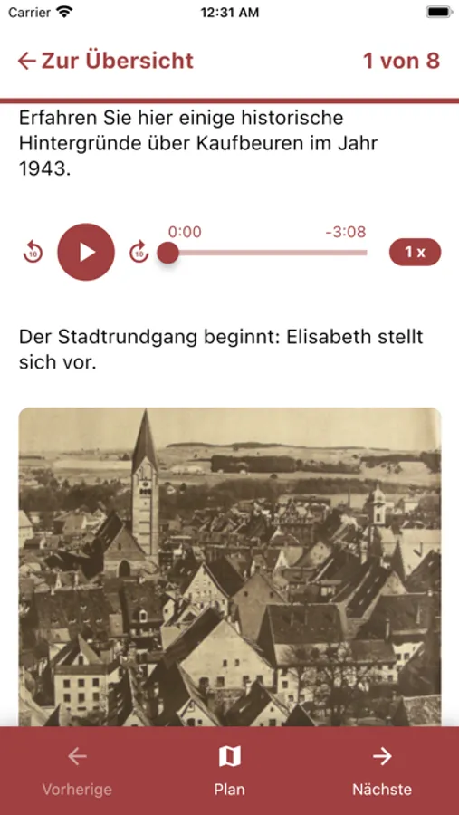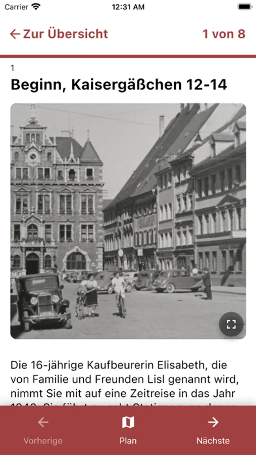 Die 16-jährige Kaufbeurerin Elisabeth nimmt Sie mit auf eine Zeitreise in das Jahr 1943. Sie führt zu acht Stationen, an denen Sie mehr über ausgewählte Kaufbeurer Opfer des Nationalsozialismus und wichtige Vorkommnisse in der Stadt erfahren.