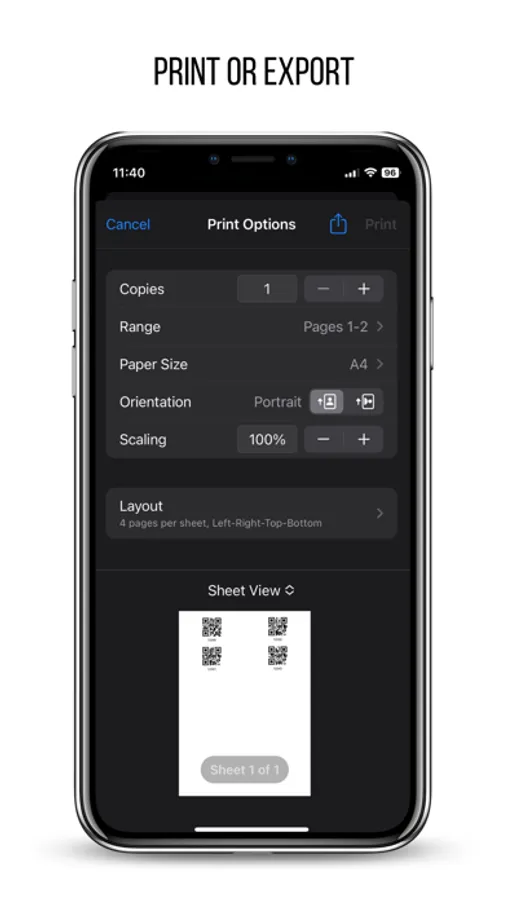 Barcode and QR Code Generator offers seamless options for utilizing your generated codes. Utilizing the export feature, you can save your codes straight to a PDF, allowing you to easily share your codes via email or messaging apps or import them into other software applications. Or, if you prefer physical copies to use immediately, our app provides direct printing options so you can print your codes directly from your device and start using them in your projects.