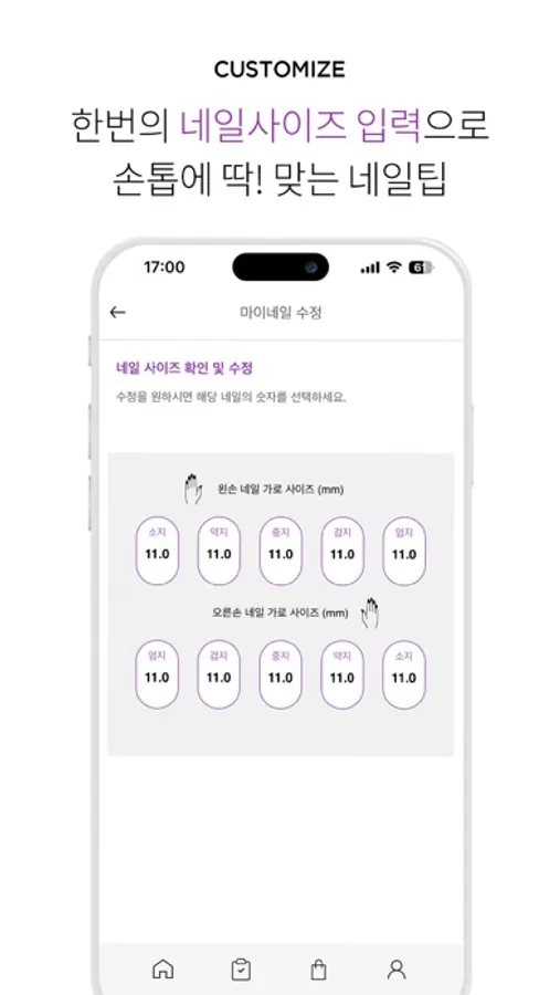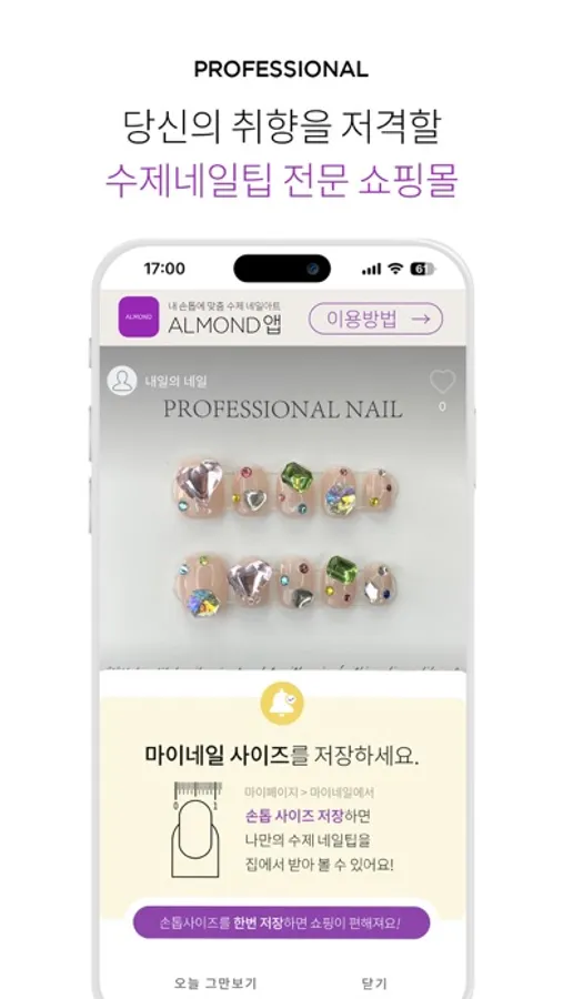아몬드 앱에서는 나의 손톱 사이즈를 한번만 입력하면, 몇 번의 클릭만으로 편리하게 집으로 네일아트가 배송됩니다.
