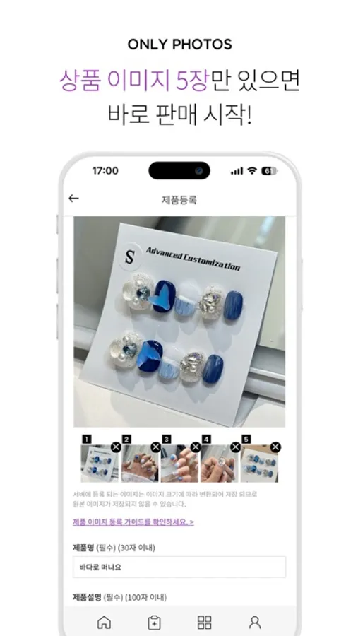 사진 5장만 있으면 네일 크리에이터로서 상품 판매를 시작 할 수 있습니다.