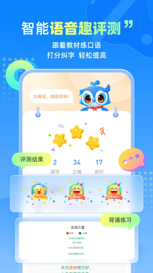 覆盖教、学、测的完整闭环,提供优质配套资源、独家的名师讲解视频,助力孩子自主学习。跟读评测打分功能,可实时对孩子的朗读进行准确评估,并提供针对性的反馈和建议,提升自主学习能力,让学习不仅限于课堂。