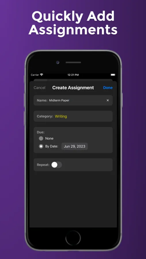 - Add, categorize, and set due dates for upcoming assignments.