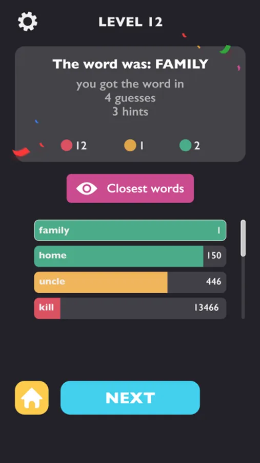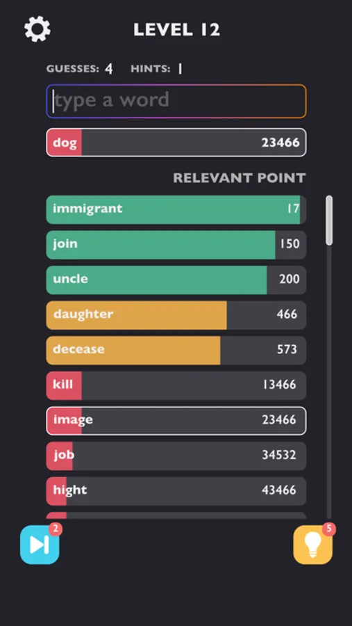 Word Quest is a word guess game. At every level, there's a secret word. You have unlimited guesses. Every time you submit a word, the artificial intelligence algorithm will tell you how similar your word is to the secret word. It's super fun and a little challenging. Have fun and train your brain.
