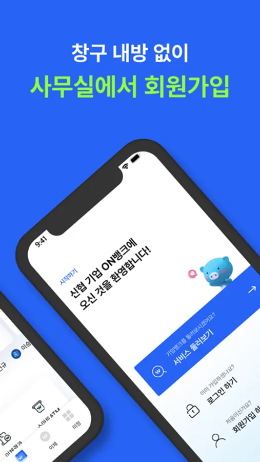 - 신분증을 소지한 개인사업자는 창구 방문없이 스마트폰으로 회원가입 후 모바일뱅킹 이용은 물론 인터넷뱅킹도 사용할 수 있습니다.