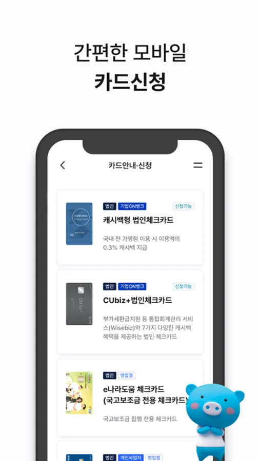 - 법인체크카드, 예적금 등 사장님에게 더 좋은 상품들을 비대면으로 가입할 수 있습니다.