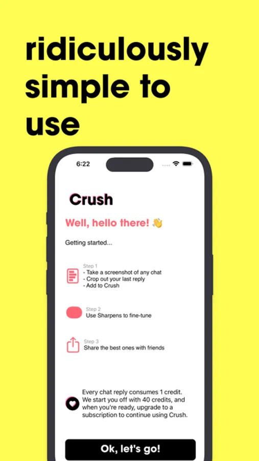 - Upload a screenshot of your text conversation, and the app will suggest a reply for 1 credit.